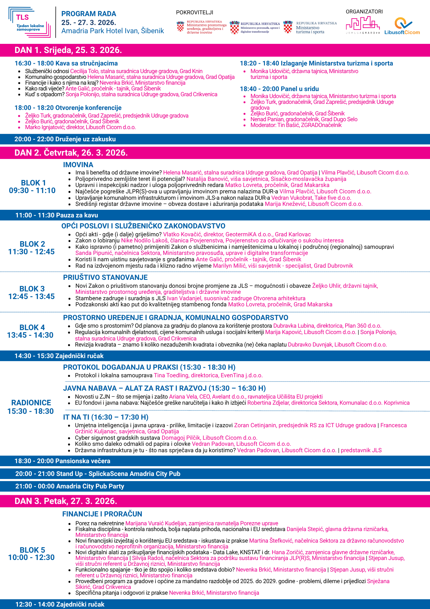 Sudionike očekuju aktualne teme iz područja financija i proračuna, komunalnog gospodarstva, prilika za financiranje projekata, radnog prava i službeničkih odnosa, općih poslova, javne nabave, upravljanja imovinom JLS-a te informacijskih tehnologija – IT-a na „Ti“.